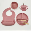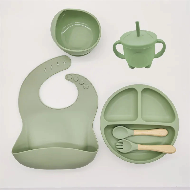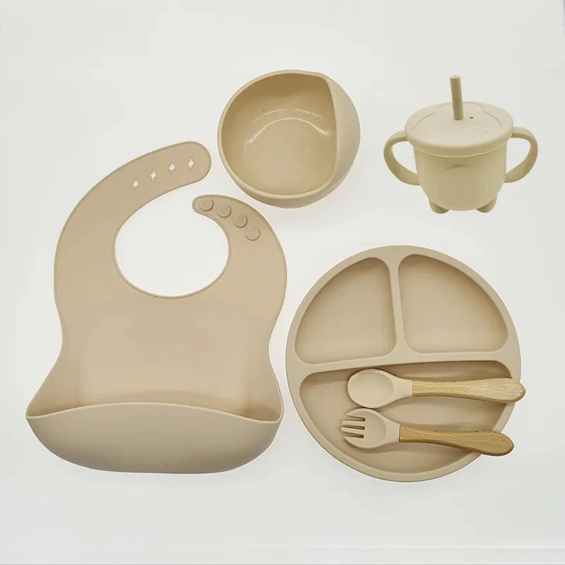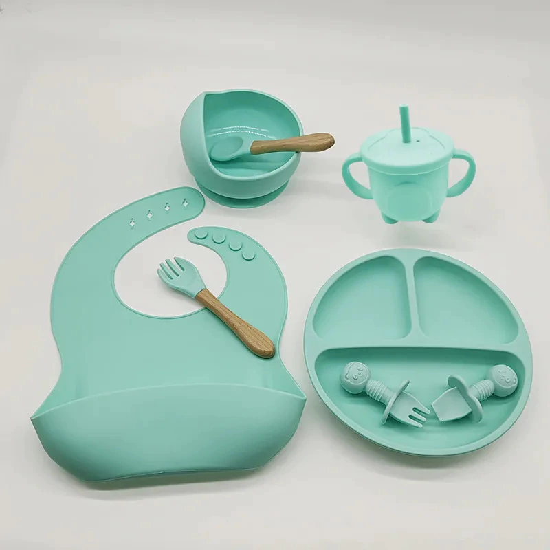 O conjunto inclui 6 peças: 1 Prato, 1 Tigela, 1 Copo com Canudinho, 1 Colher de Silicone com cabo de madeira, 1 Garfo de Silicone com cabo de madeira, 1 Copo de Aprendizado,