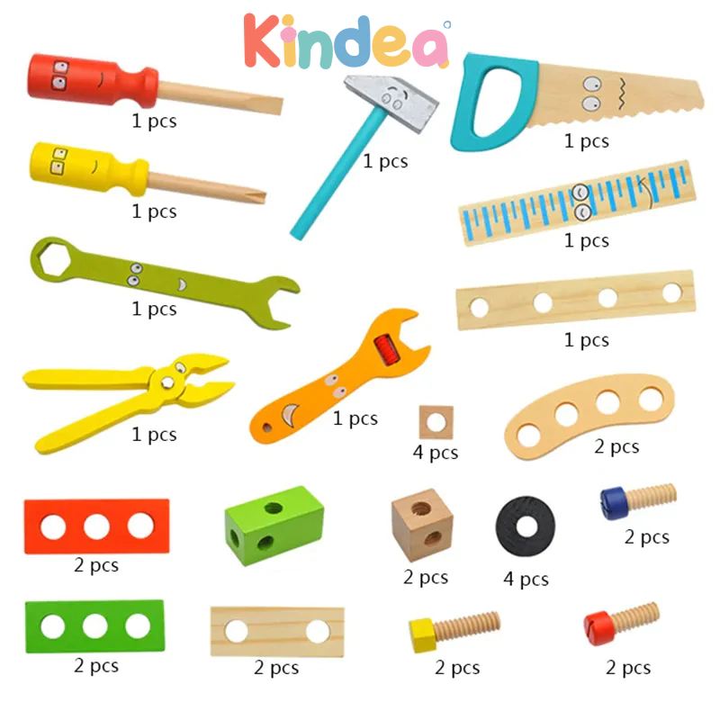 Cada peça deste conjunto é revestida com cores brilhantes e padrões bonitos, tornando a experiência ainda mais envolvente. Desde martelos e chaves inglesas até réguas, serras e parafusos, nossas ferramentas permitem que as crianças construam objetos surpreendentes.