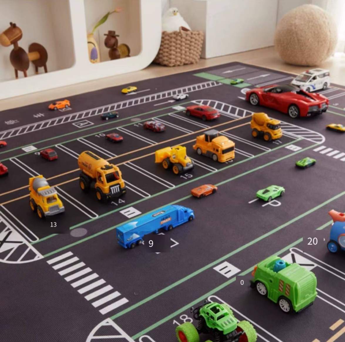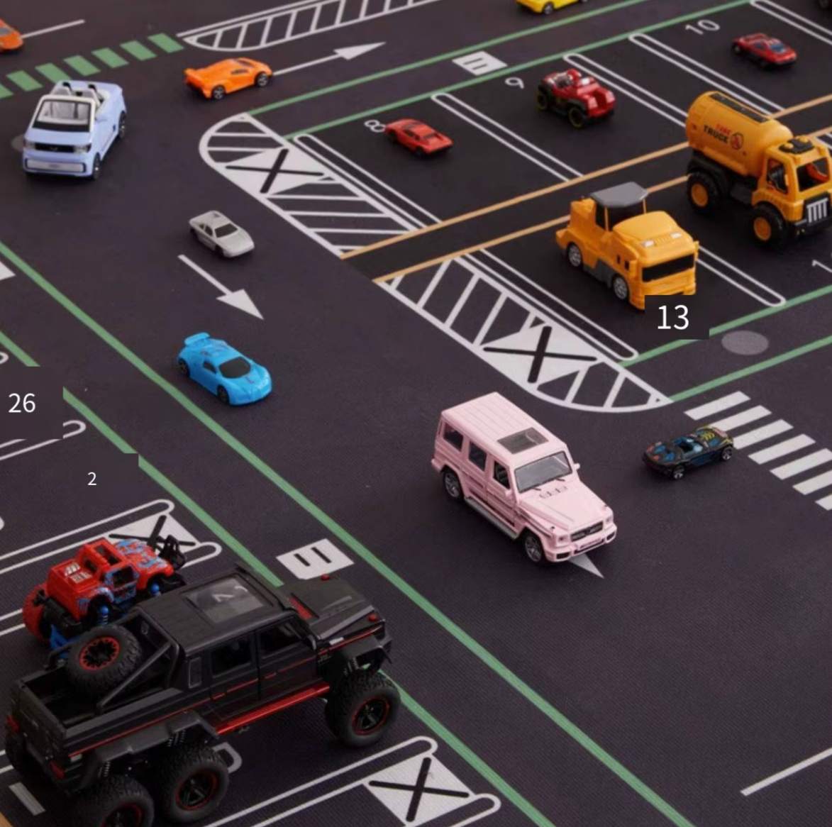 A estampa estimula a imaginação e incentiva brincadeiras criativas com carrinhos. A criança cria trajetos, organiza caminhos e desenvolve coordenação motora enquanto se diverte no próprio espaço.